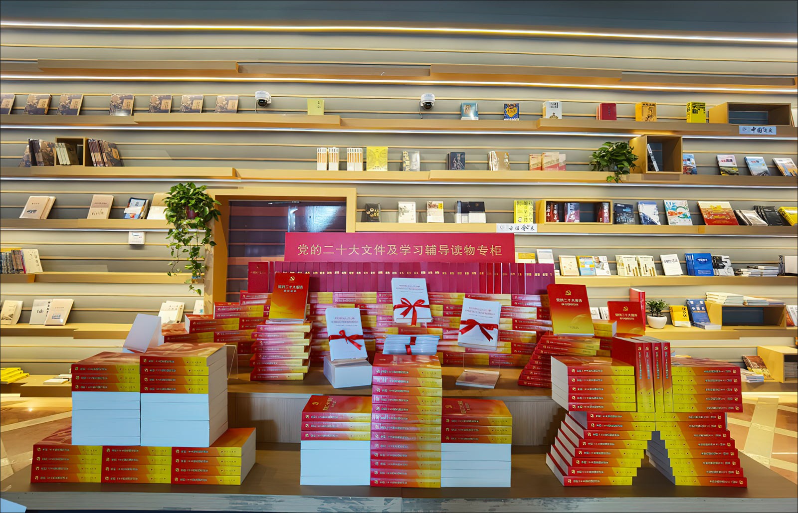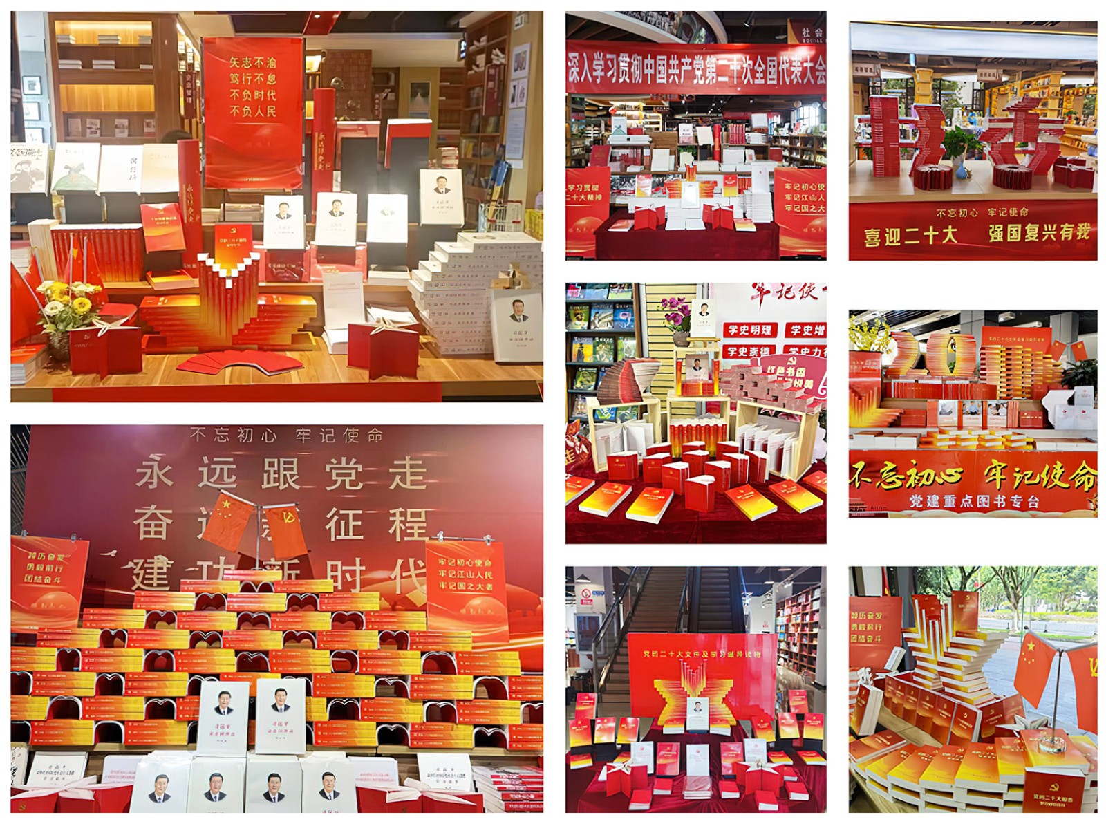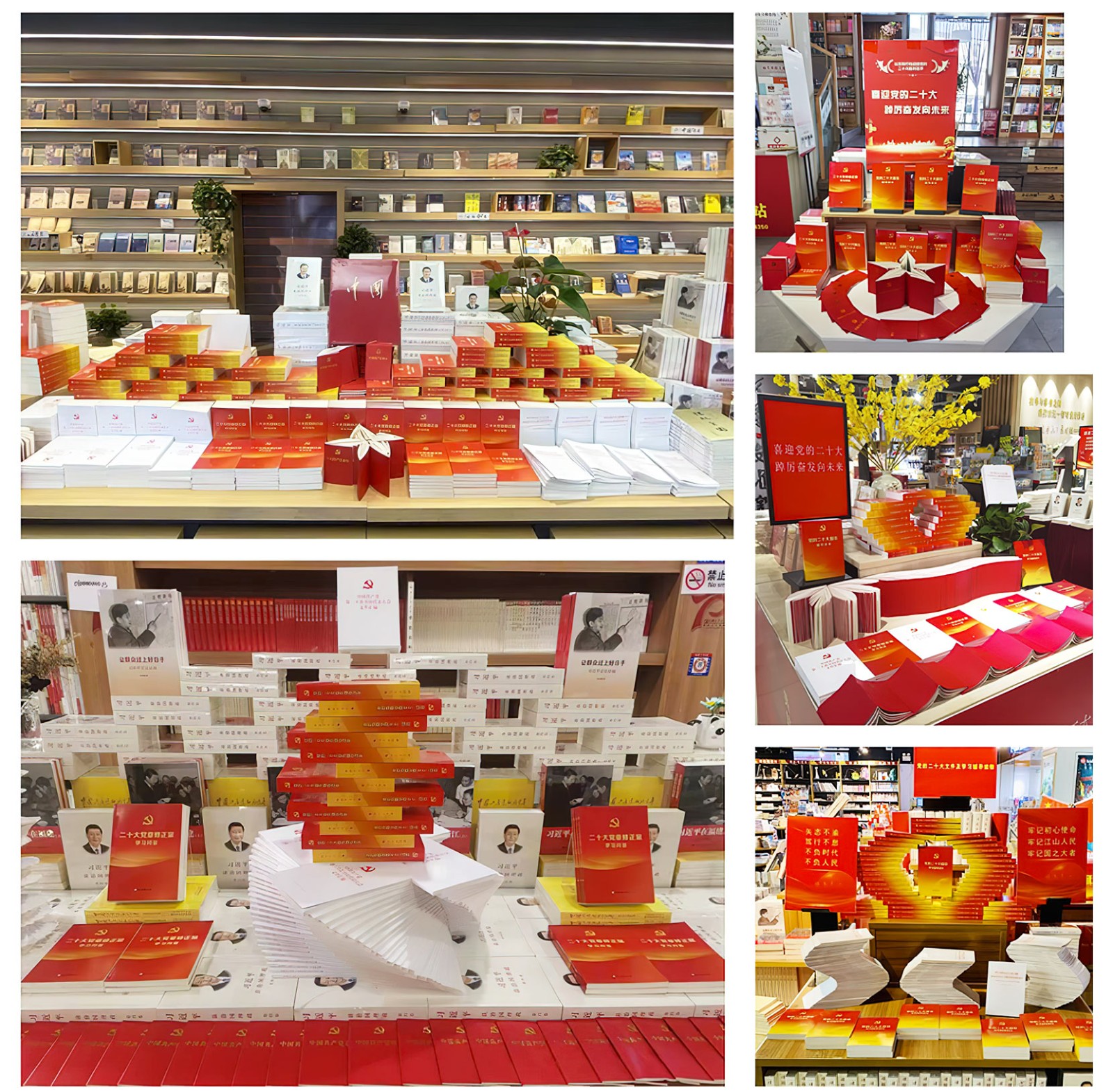 目前,16個(gè)州(市)129個(gè)縣(市、區(qū))新華書店充分利用152家連鎖店,174家鄉(xiāng)愁書院,127家校園書店的網(wǎng)點(diǎn)優(yōu)勢(shì),結(jié)合門店特色,在最佳區(qū)域設(shè)置專題展柜展臺(tái),張貼海報(bào),采用電子顯示屏滾動(dòng)播放圖書發(fā)行信息,重點(diǎn)宣傳黨的二十大文件及學(xué)習(xí)輔導(dǎo)讀物。