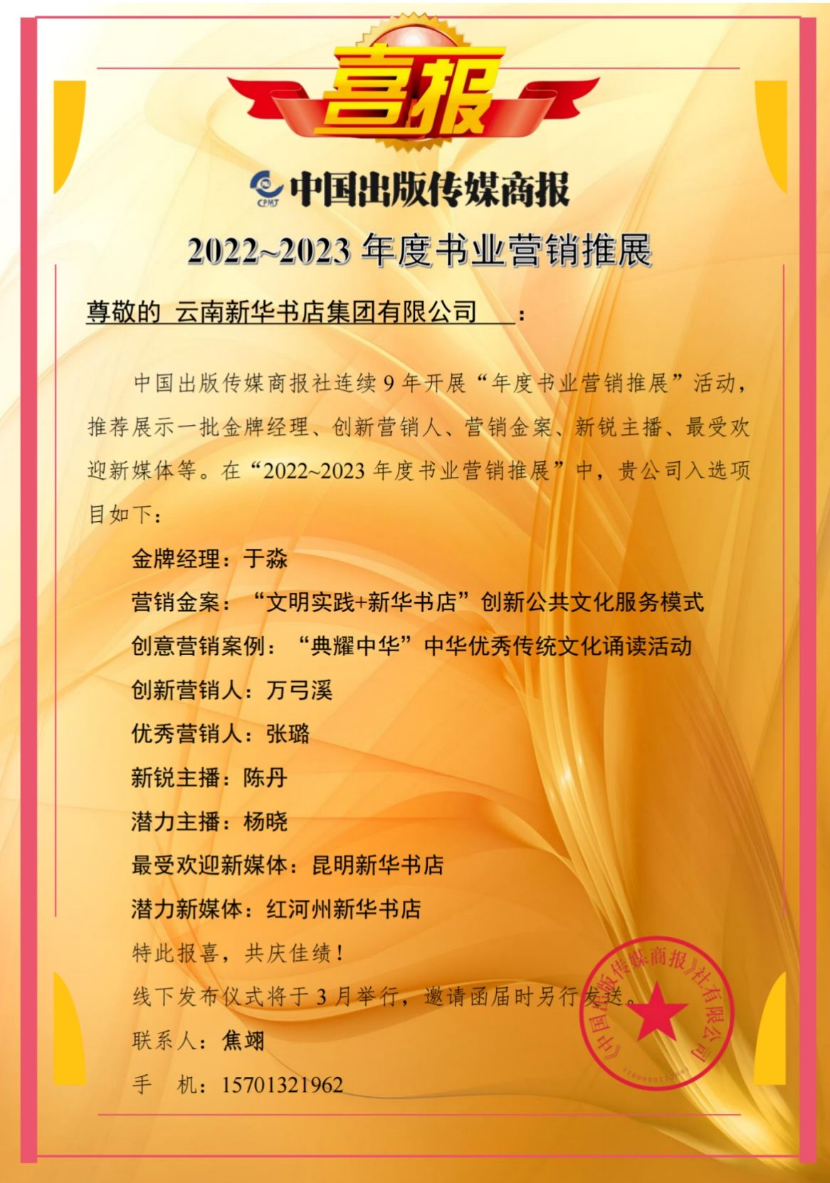 近日,由中國新華書店協(xié)會、中國出版?zhèn)髅缴虉笊缏?lián)合主辦的2023年度書業(yè)營銷推展發(fā)布活動在北京舉行?;顒咏視?022~2023年度書業(yè)營銷推展結(jié)果,書店集團獲營銷金案、金牌經(jīng)理等9個獎項。